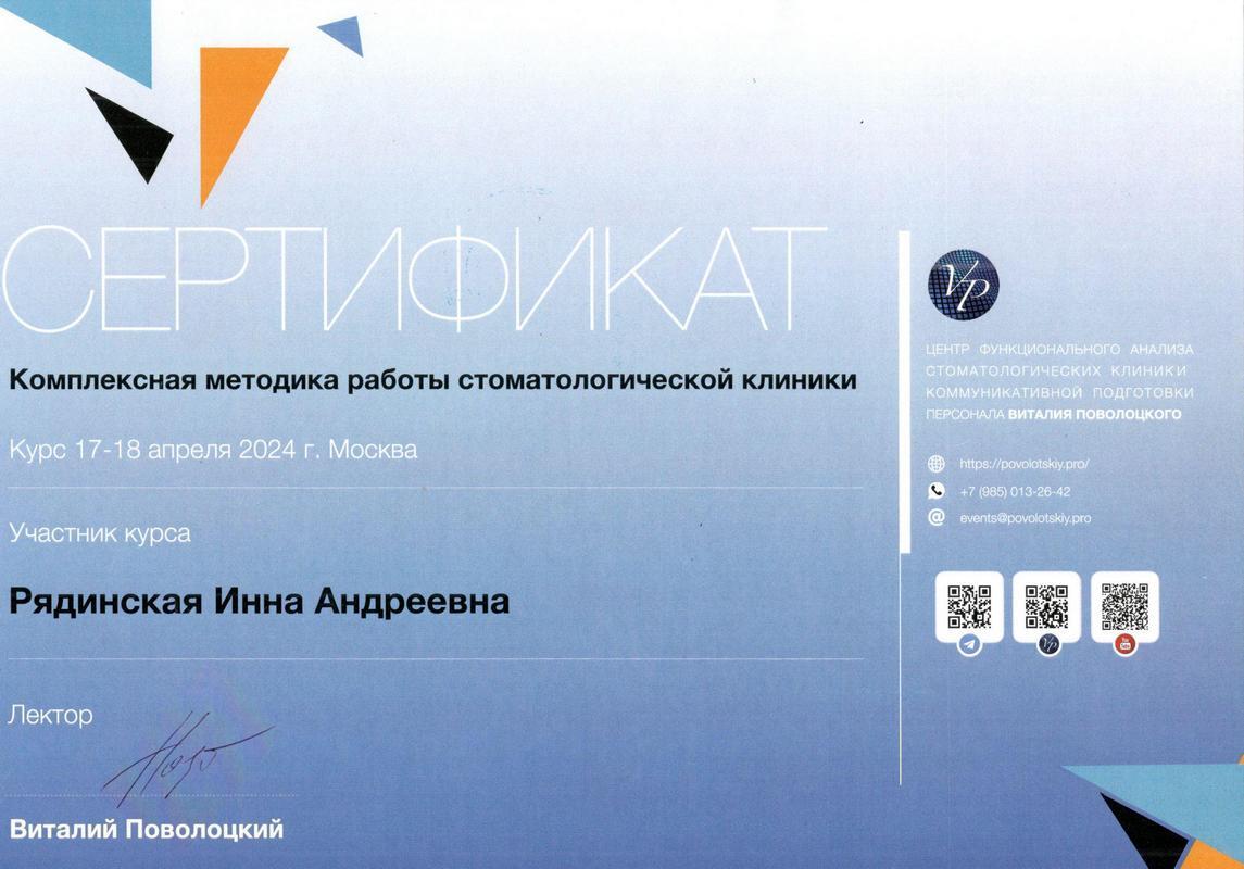 2025г. — Удостоверение о повышении квалификации «Стоматология терапевтическая ООО «Учебный центр «Академия профессионального развития». Сертификат действителен 5 лет