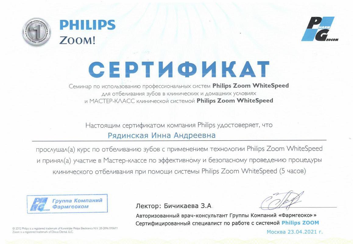 2021г. — курс по отбеливанию Зубов с применением технологии Philips Zoom WhiteSpeed, лектор - Бичикаева З.А.