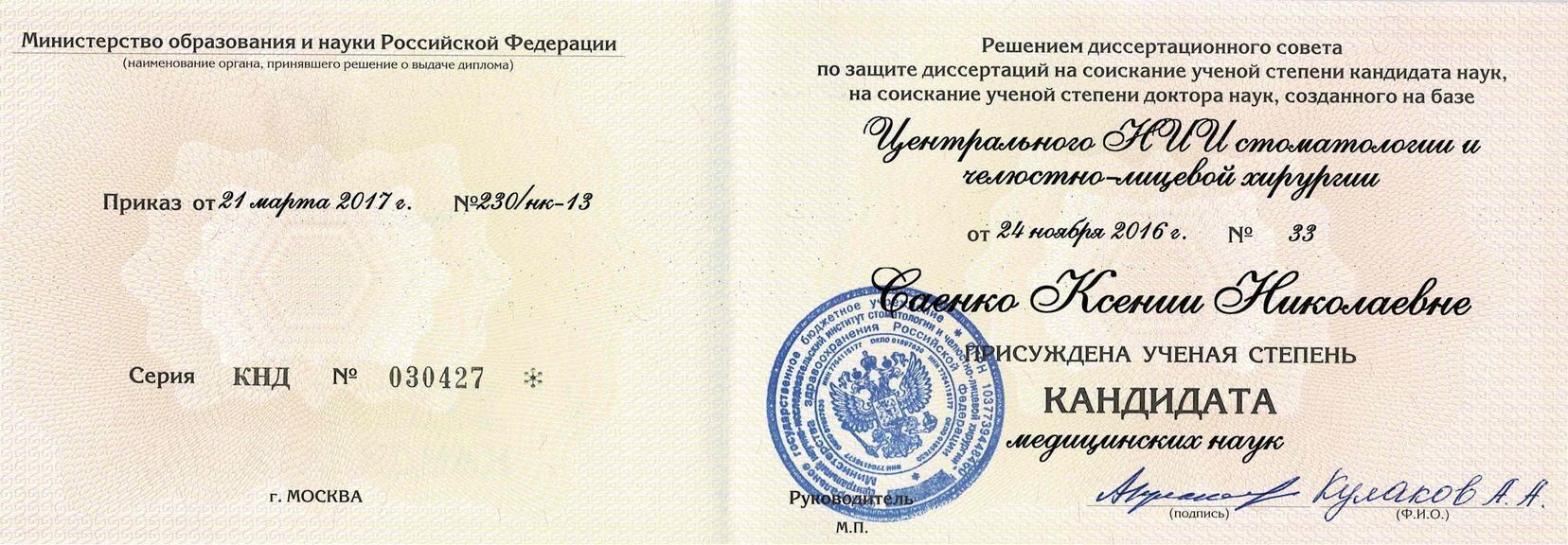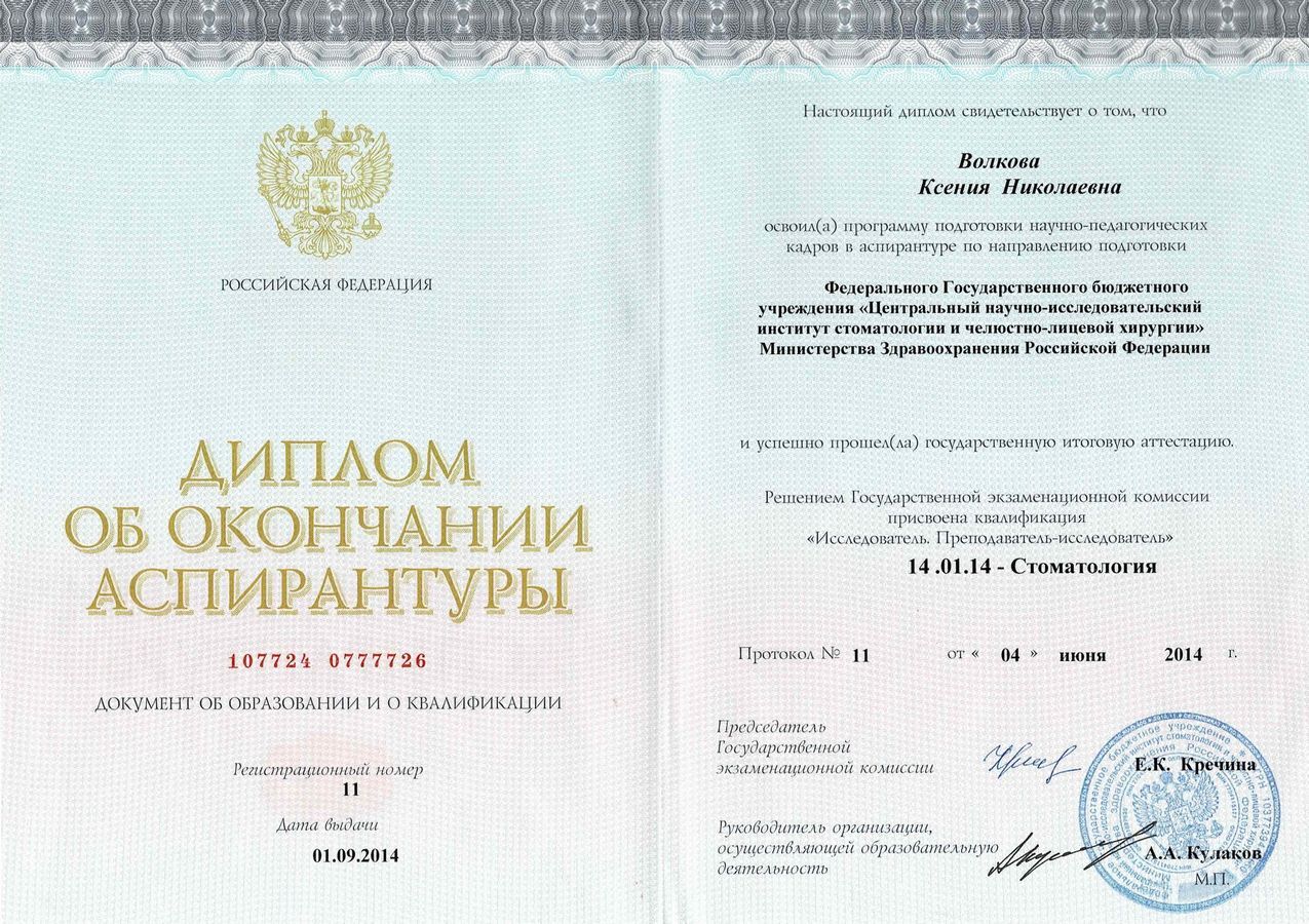 2014г. — ЦНИИСиЧЛХ Росмедтехнологий аспирантура по специальности: стоматология