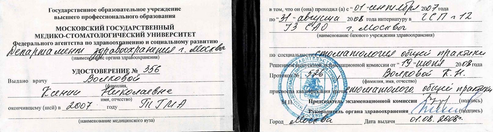 2008г. — ГСП №12 интернатура по специальности стоматология общей практики