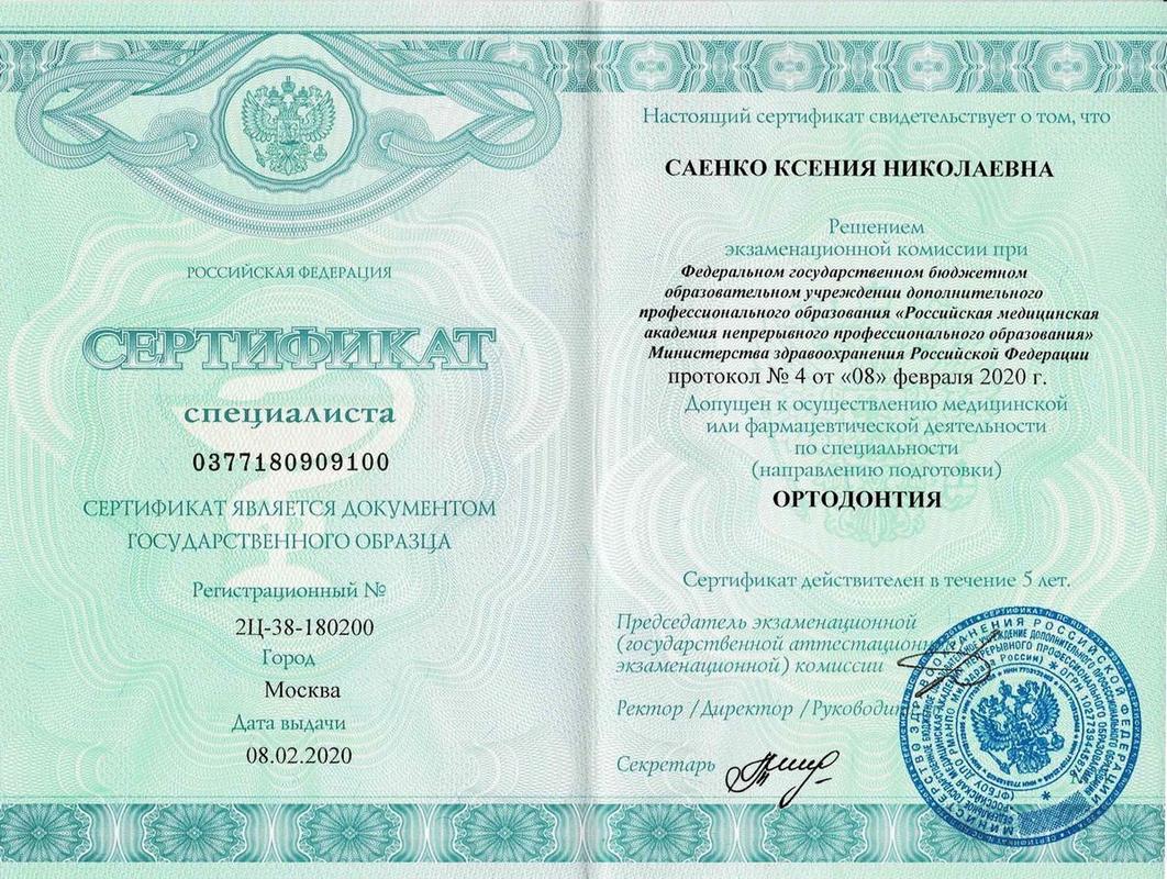 2023г. – Повышение квалификации по дополнительной профессиональной программе «Ортодонтия» в объёме 144 часа. РМАПО МЗ РФ.