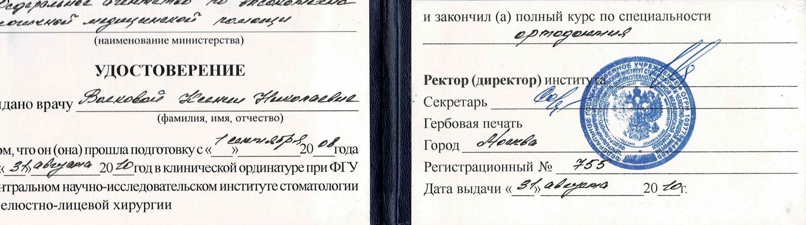 2010г. — ЦНИИСиЧЛХ Росмедтехнологий ординатура по специальности ортодонтия