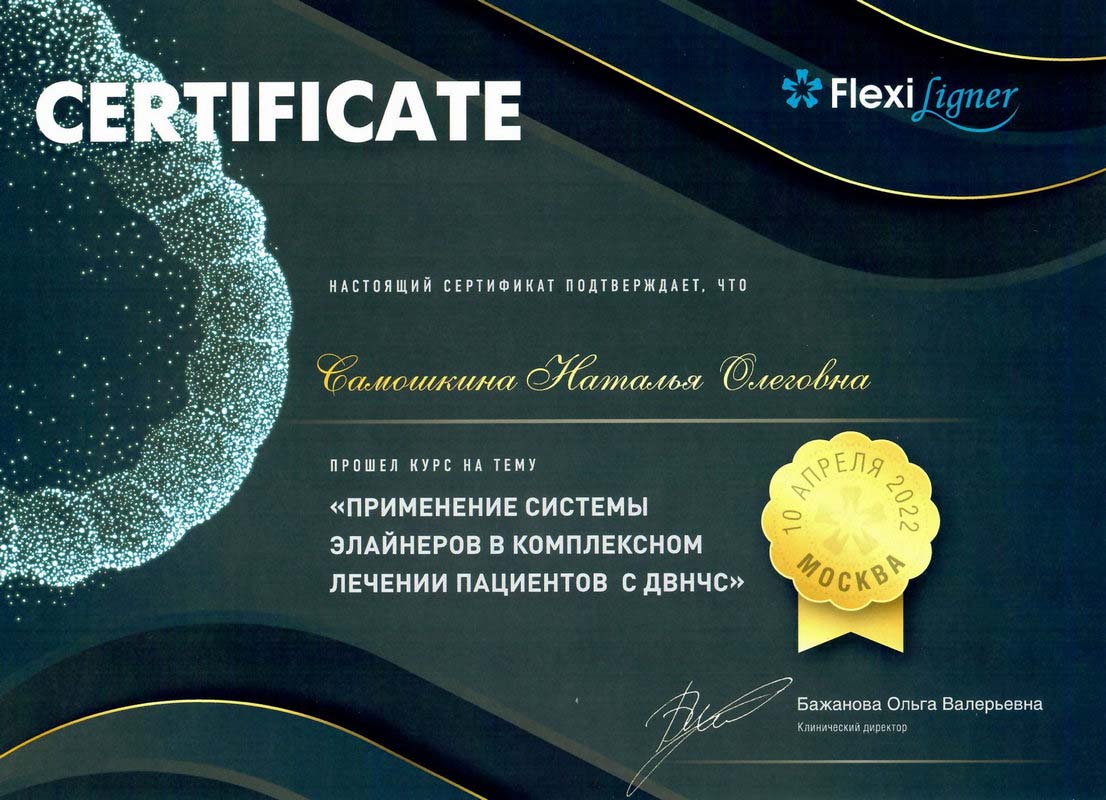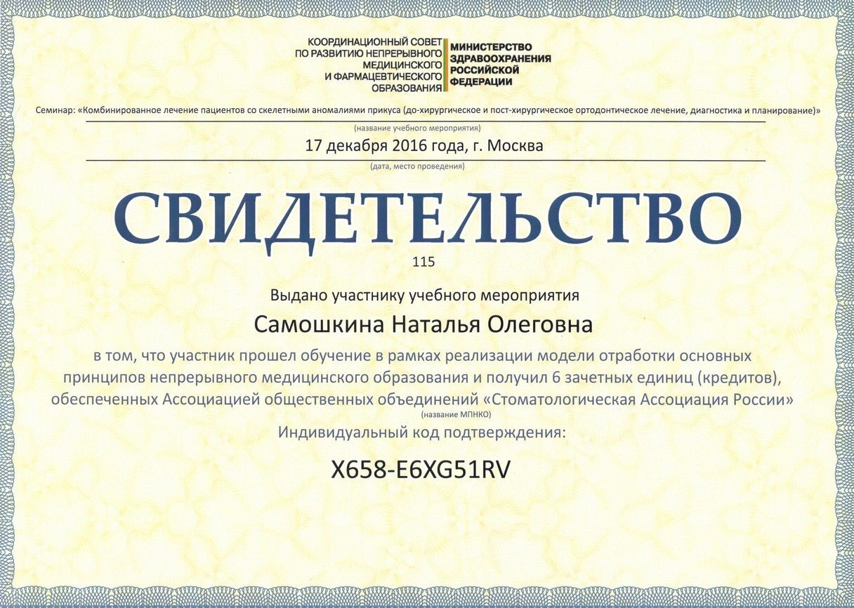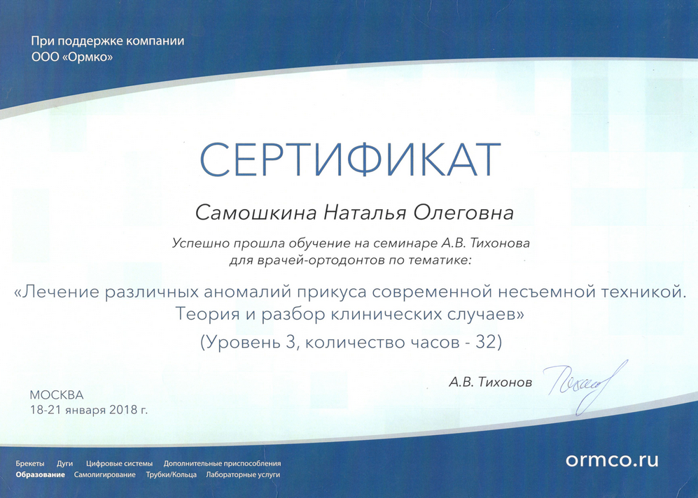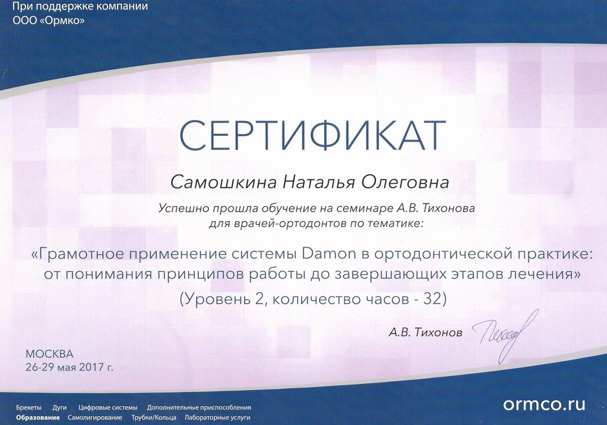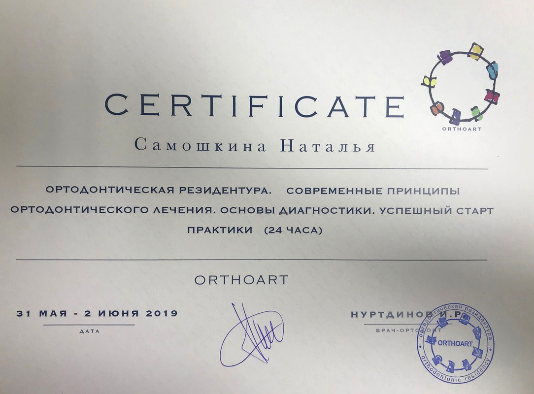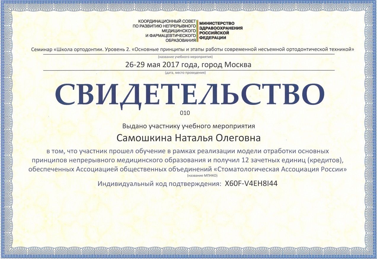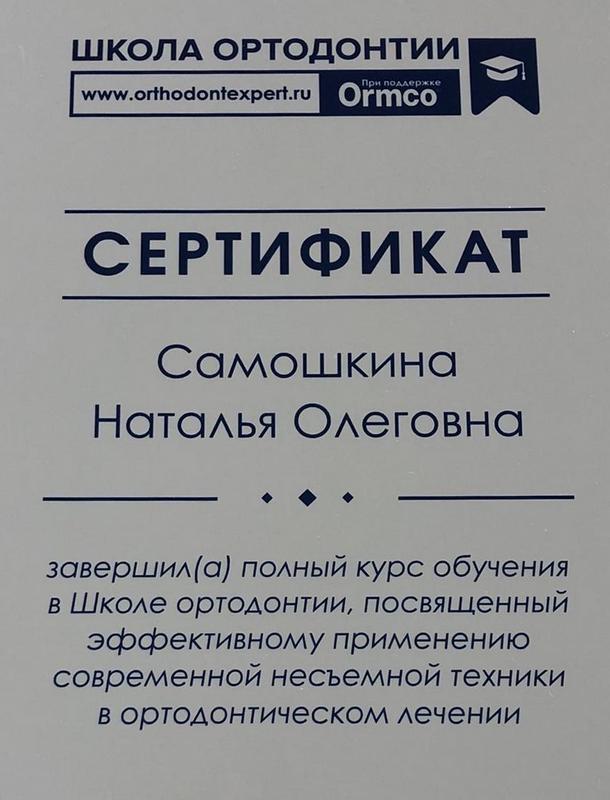 - 2017г. — Сертификат по специальности «Ортодонтия»