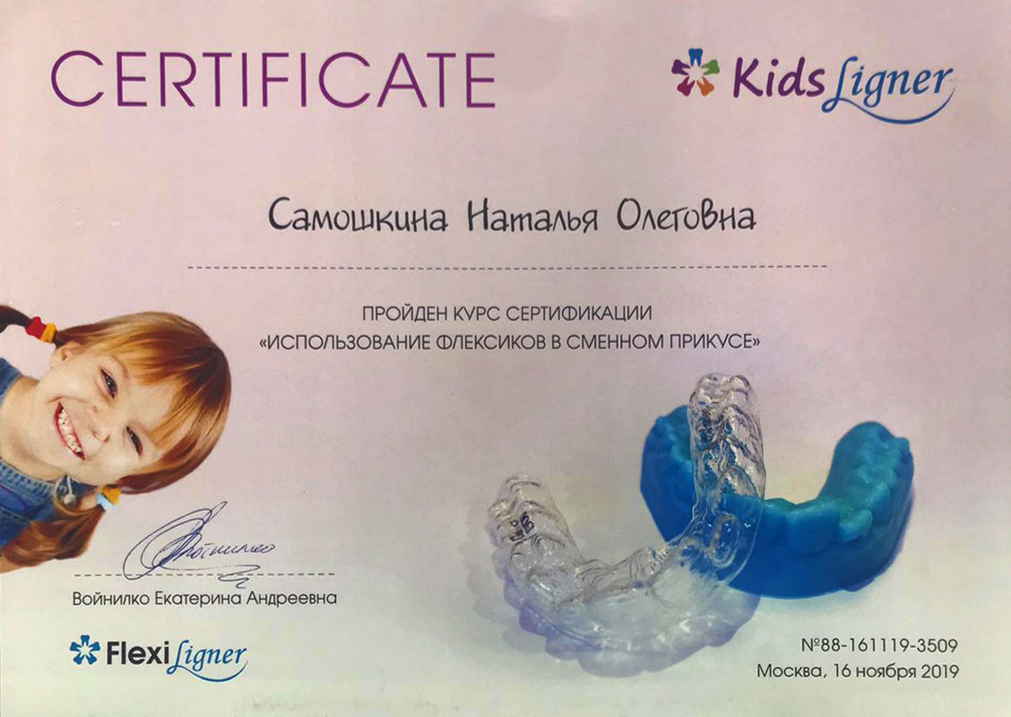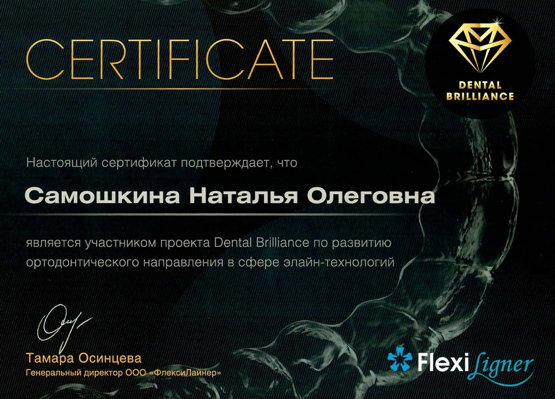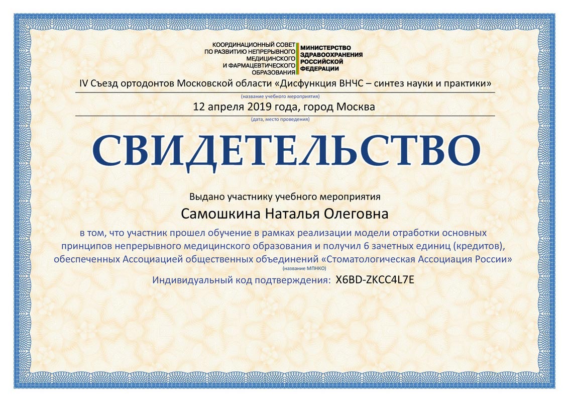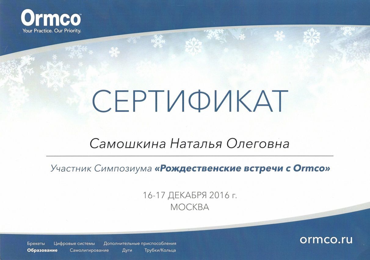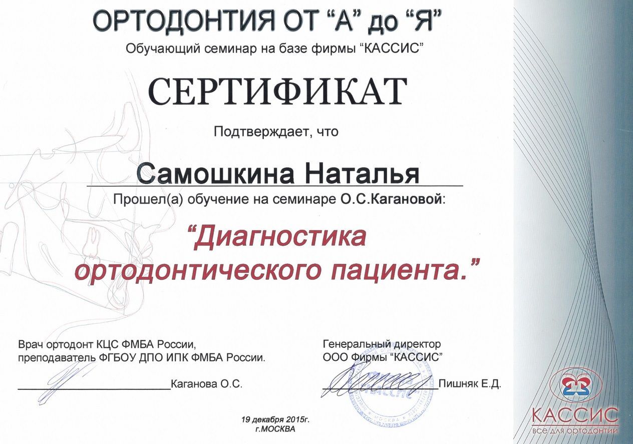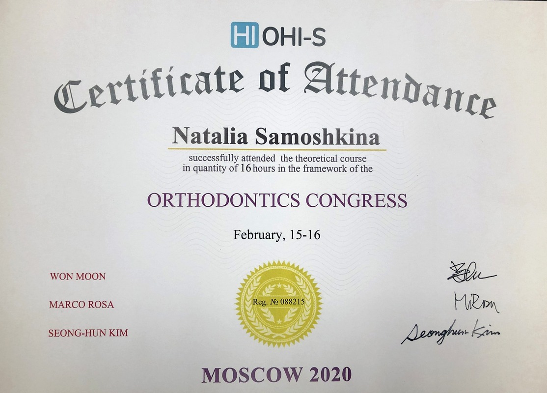 - 2017г. — Сертификат по специальности «Ортодонтия»