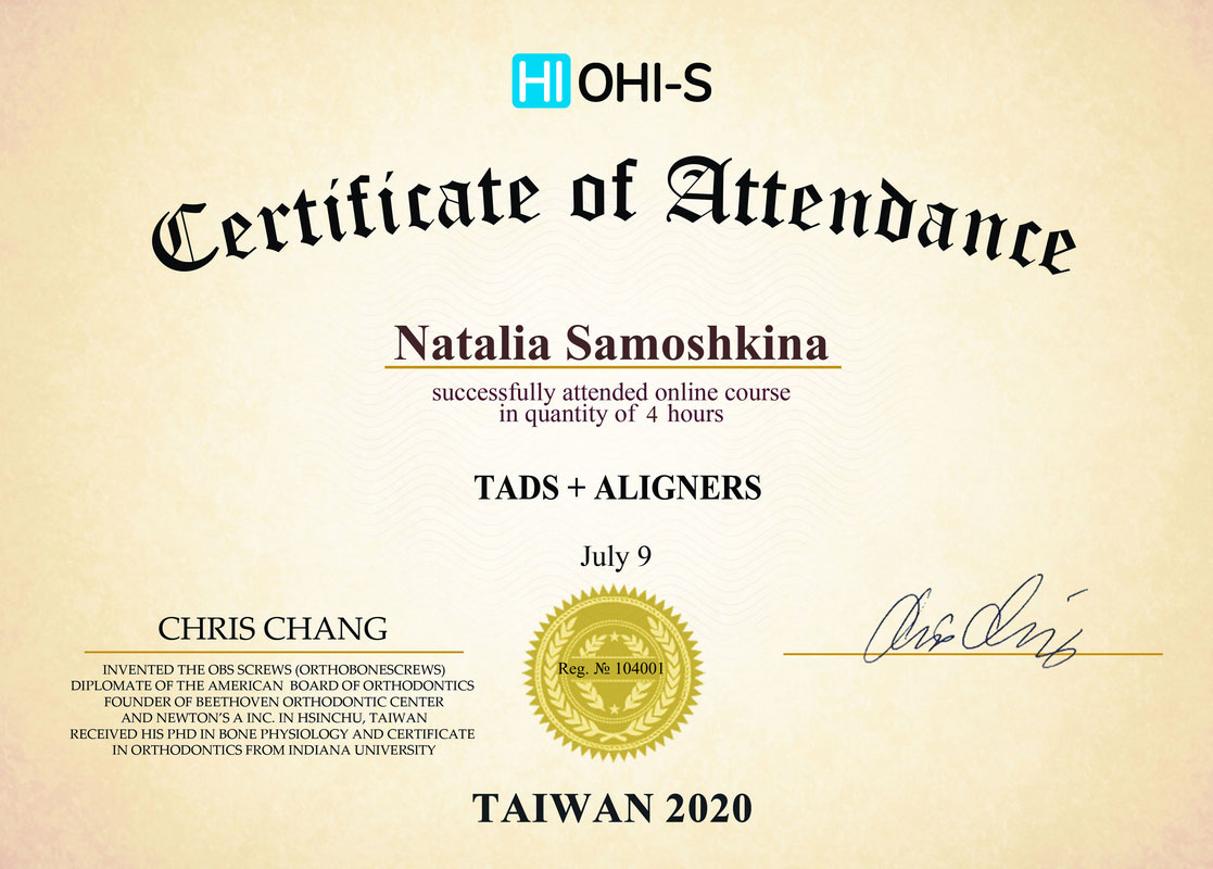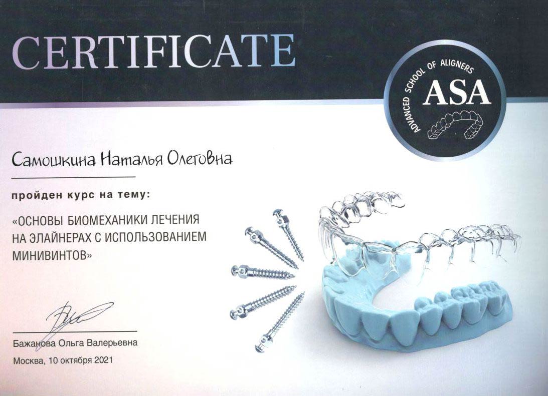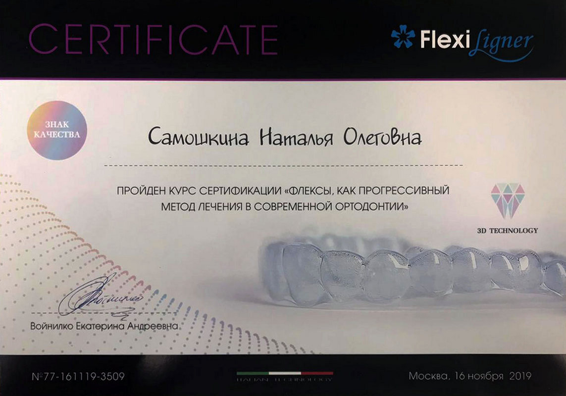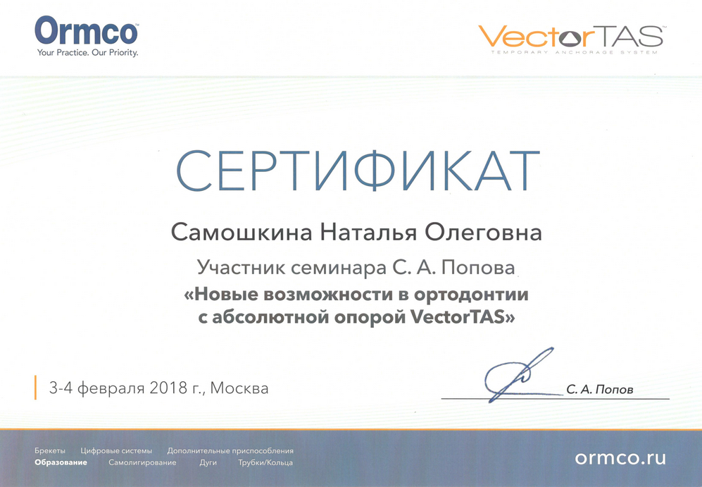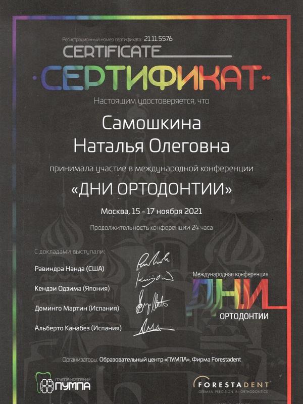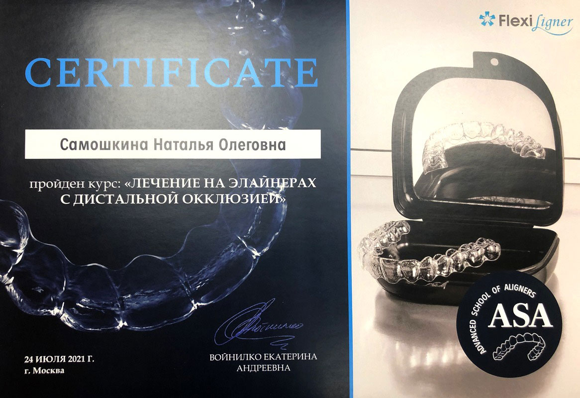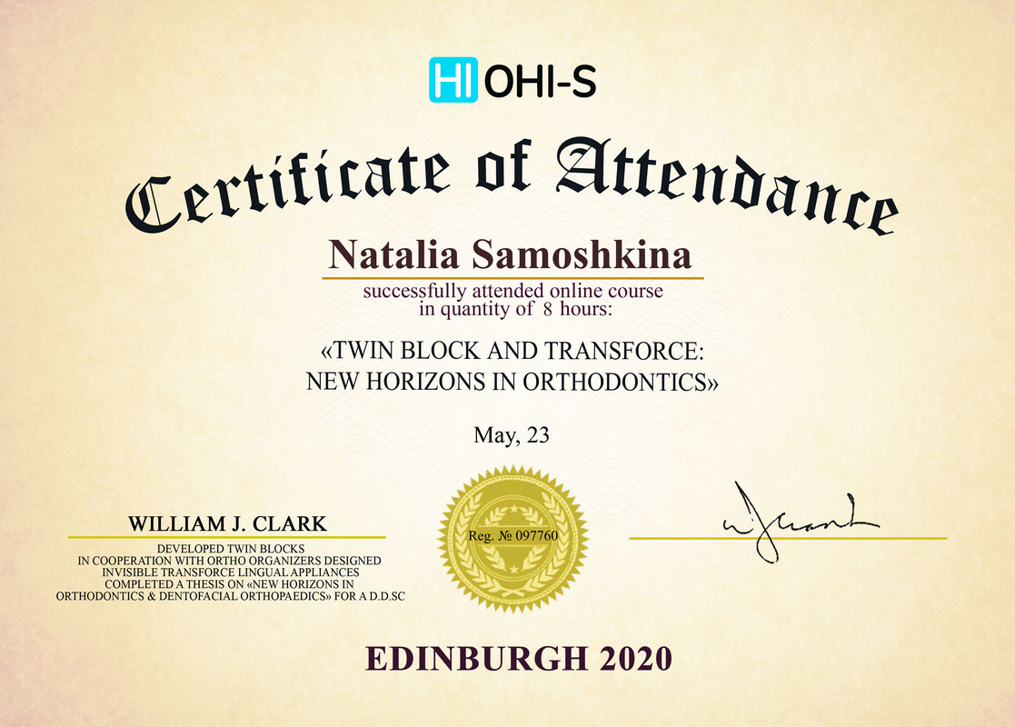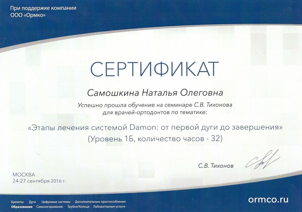 - 2017г. — Сертификат по специальности «Ортодонтия»