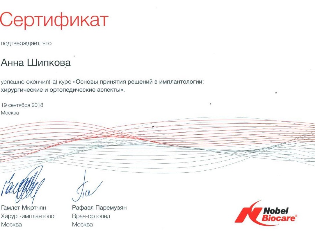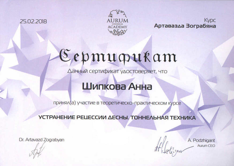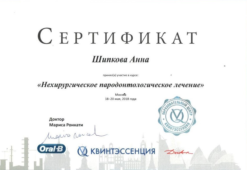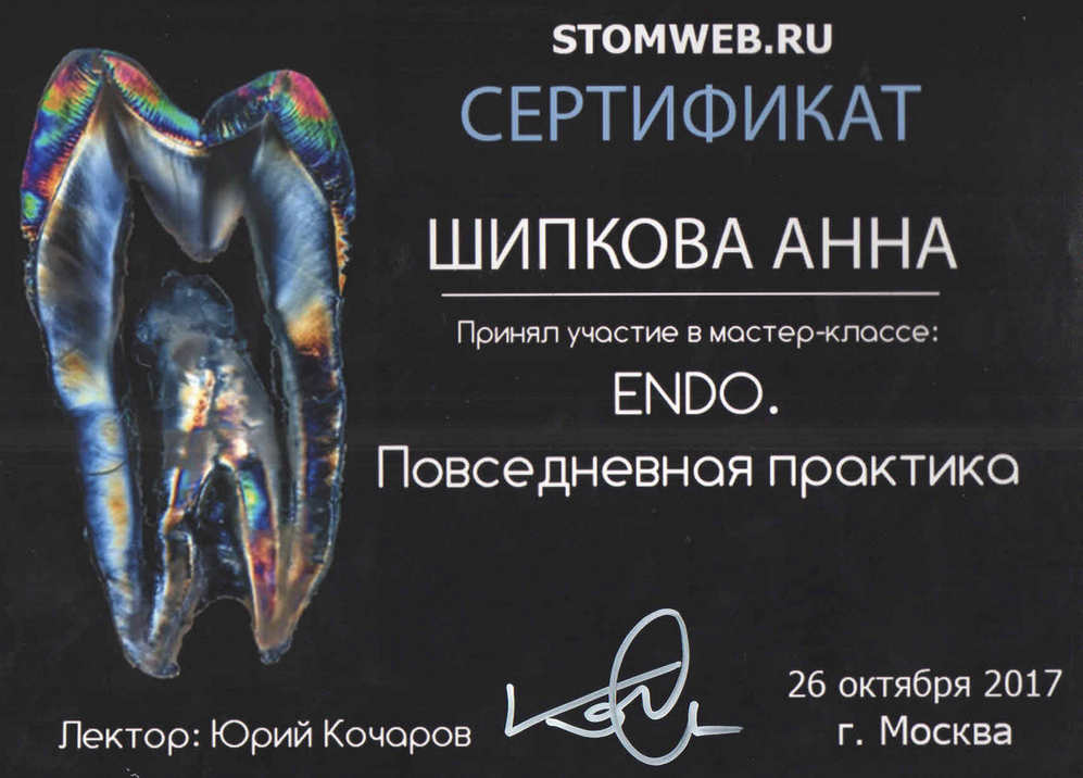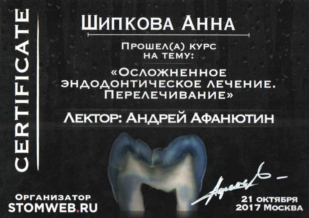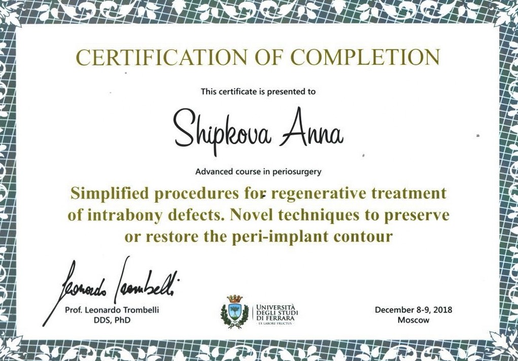 - Диплом по специальности врач-стоматолог. Московский государственный медико-стоматологический университет имени А. И. Евдокимова20142014
