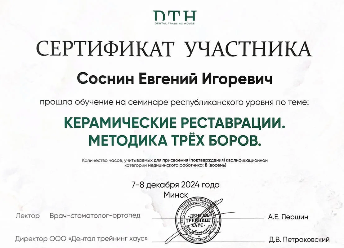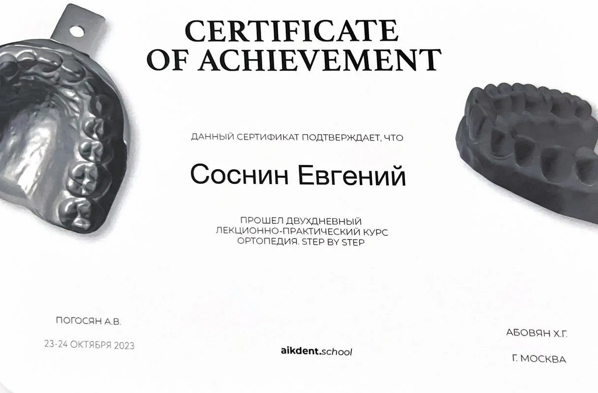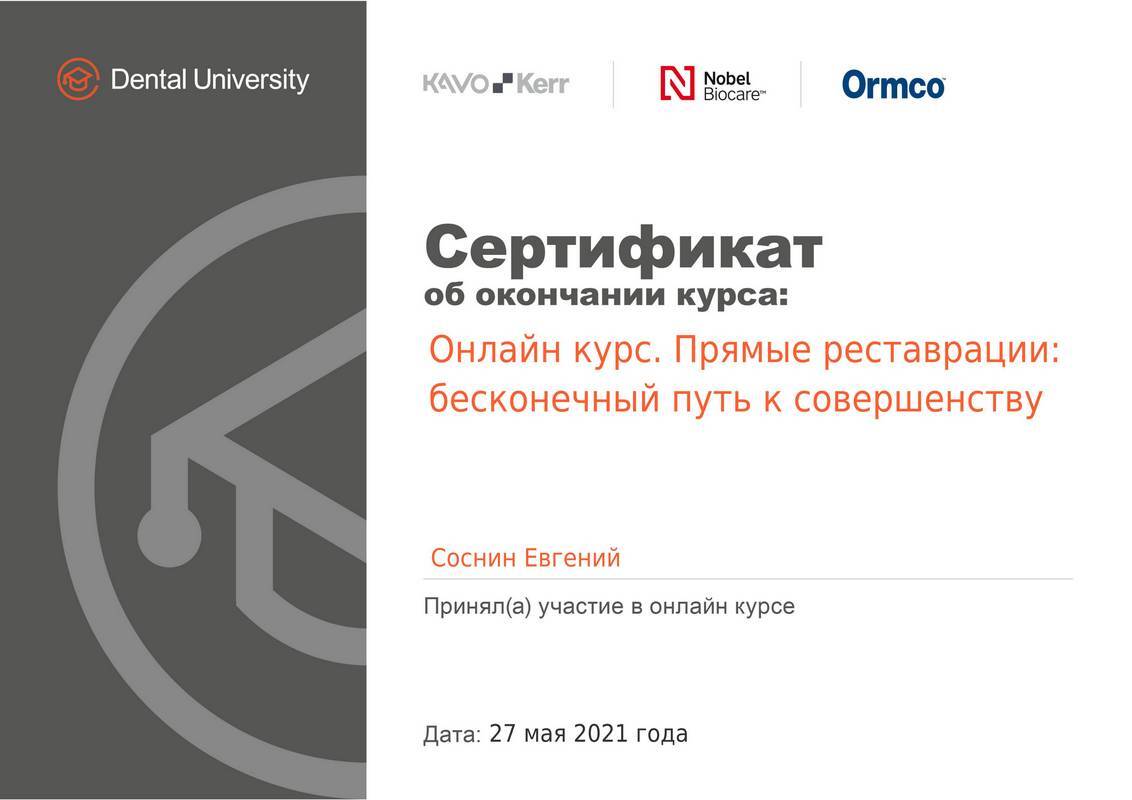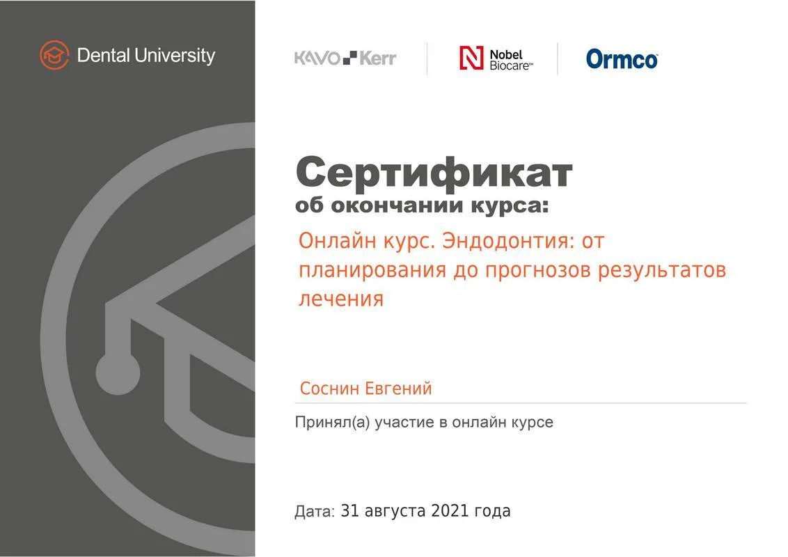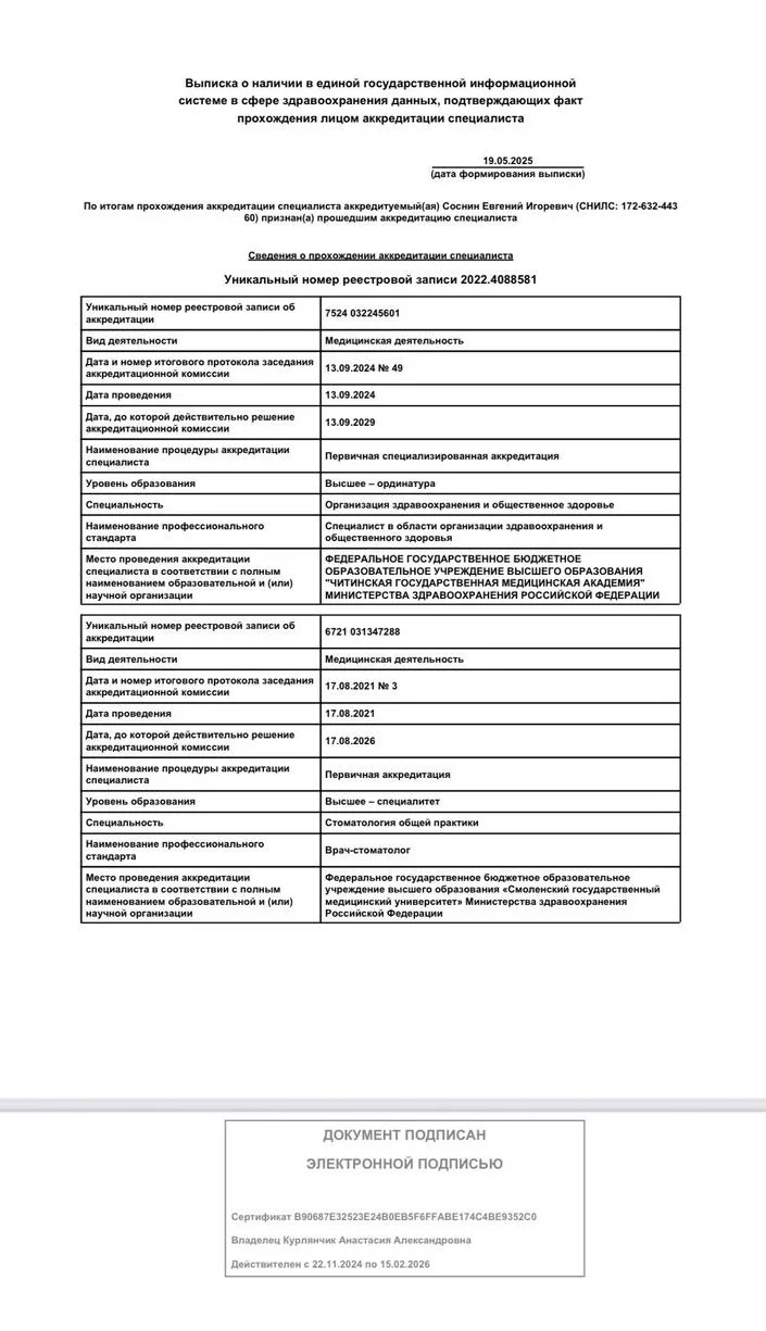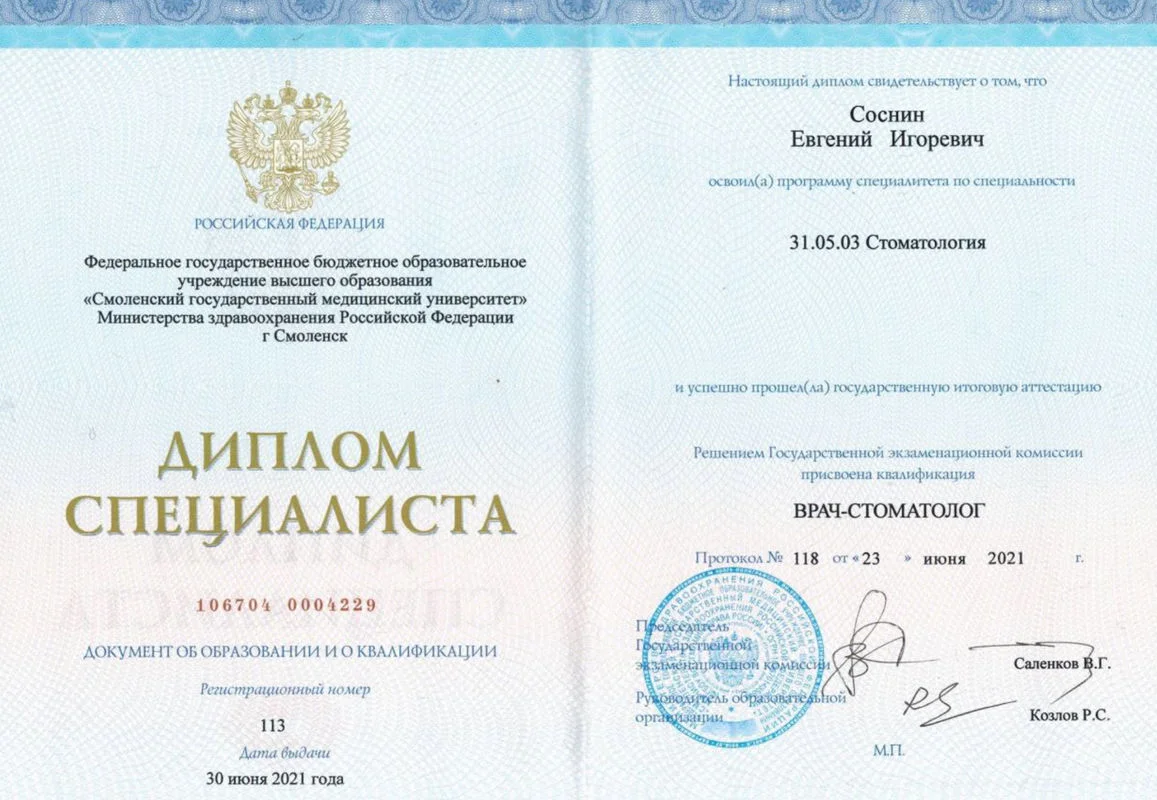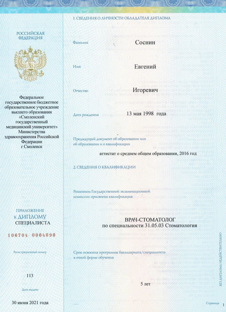 2021г. — Смоленский Государственный Медицинский Университет (СГМУ). Специальность «Стоматология», г.Смоленск;