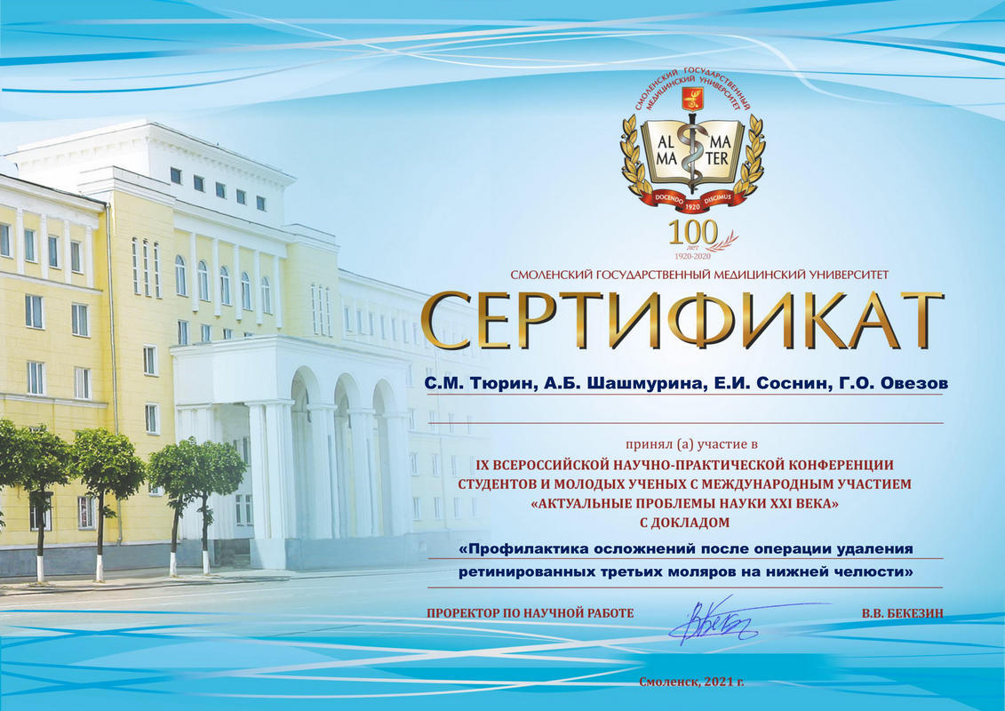 2021 г. — Профилактика осложнений после операции удаления ретинированных третьих моляров на нижней челюсти.