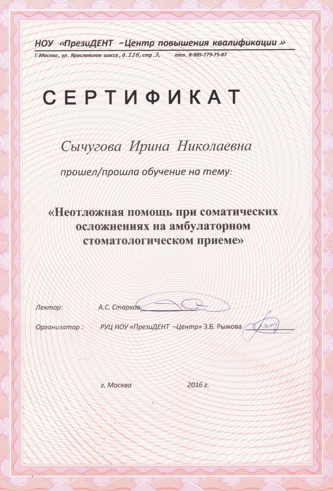 Сертификат специалиста по специальности «Рентгенология» ООО «Современные образовательные технологии» Институт непрерывного обучения медицинских работников