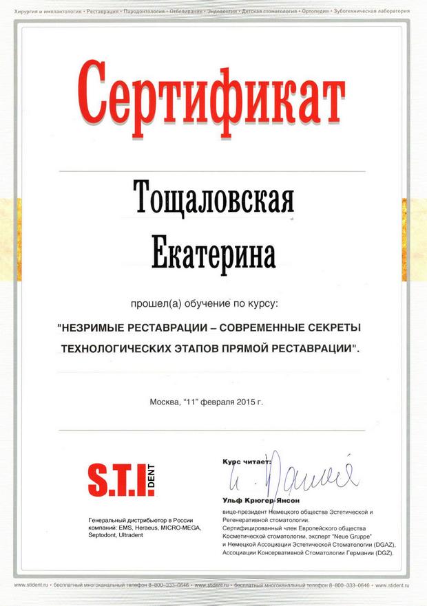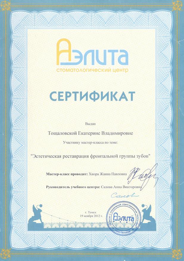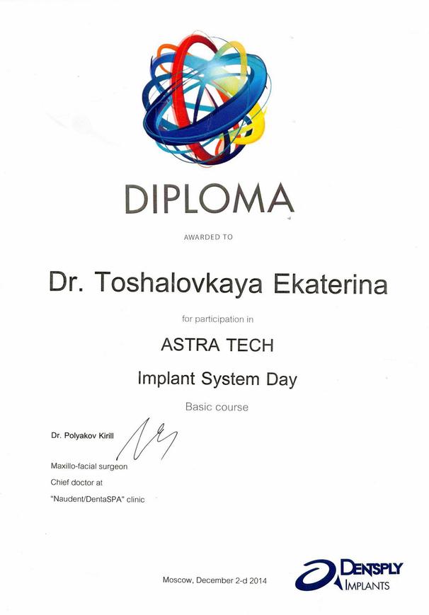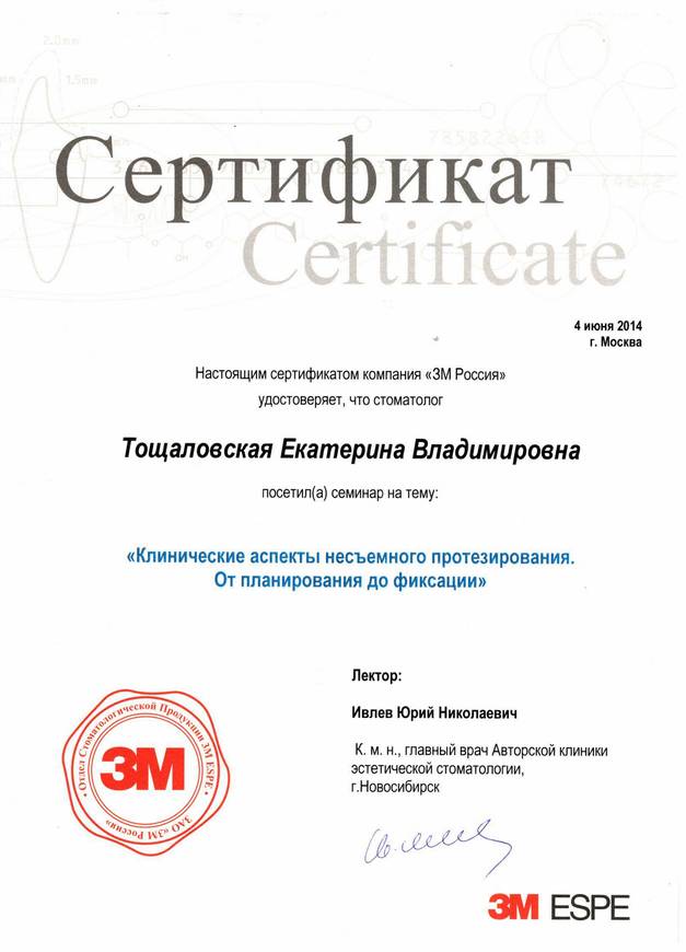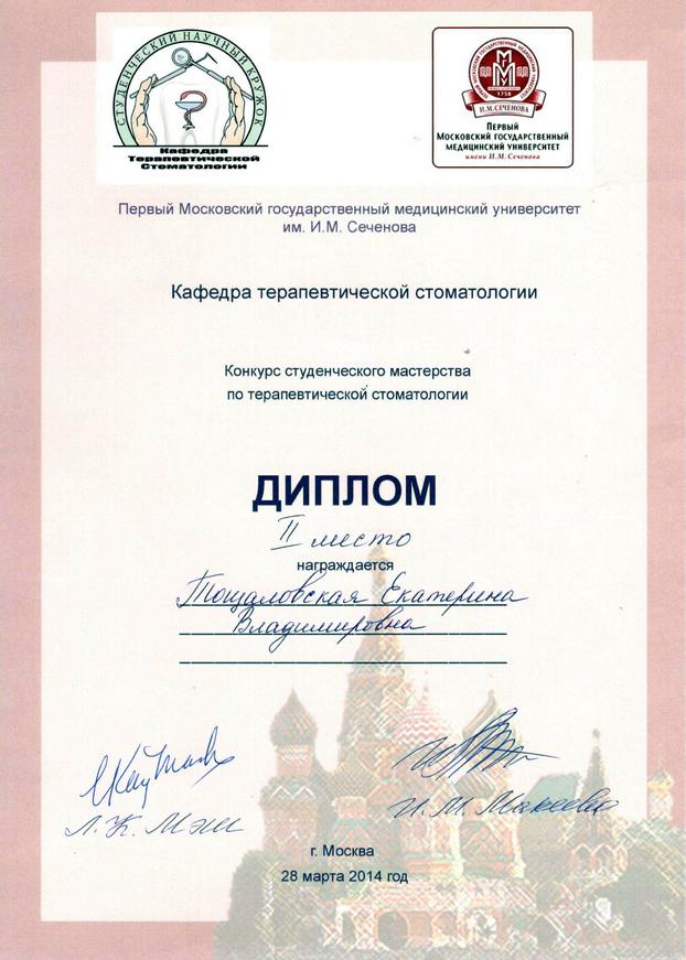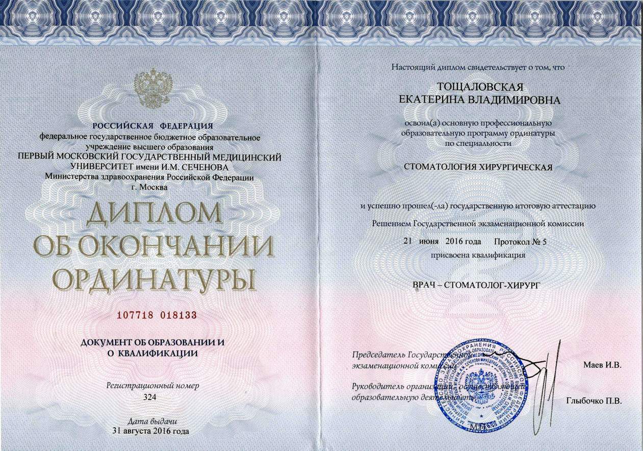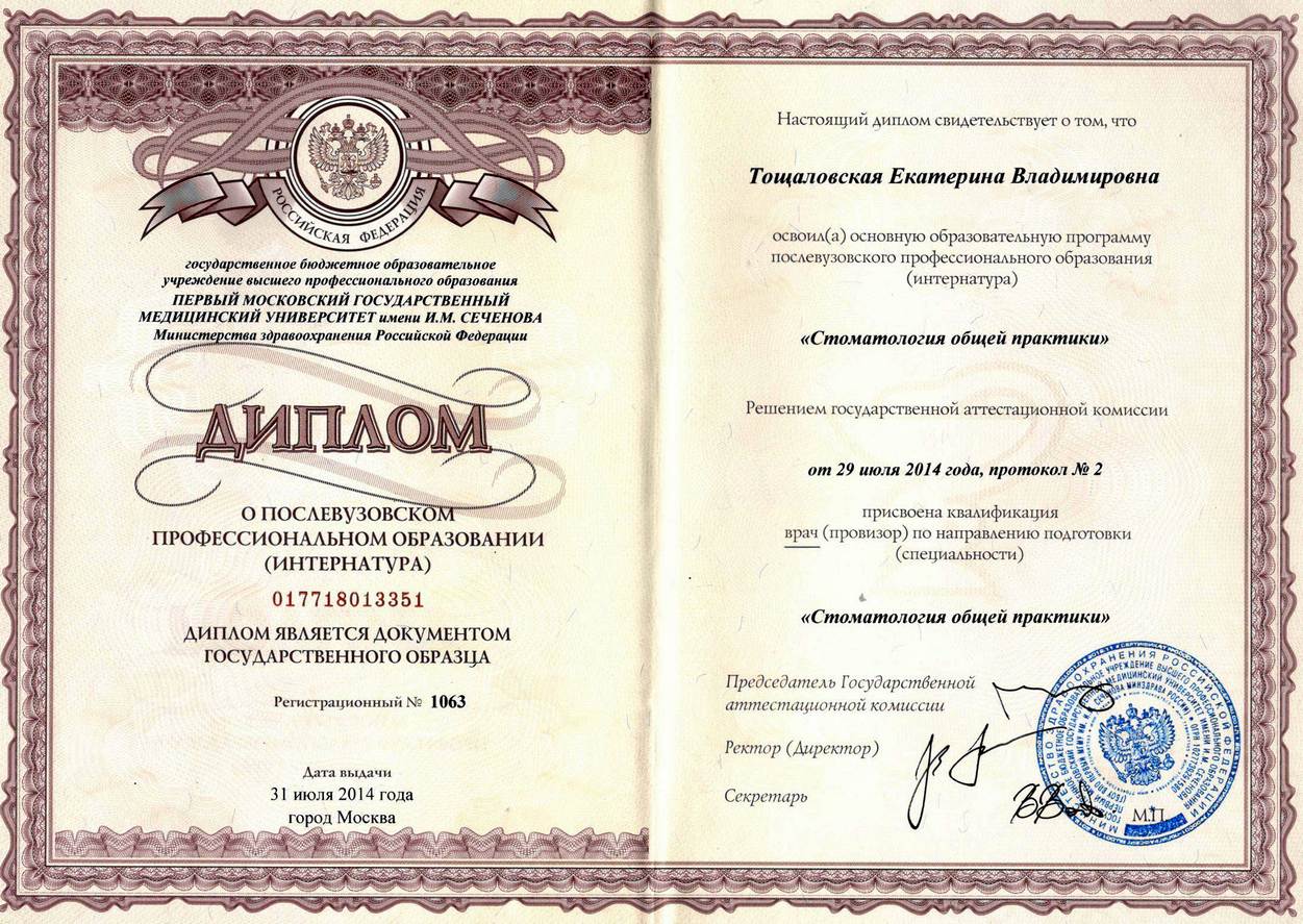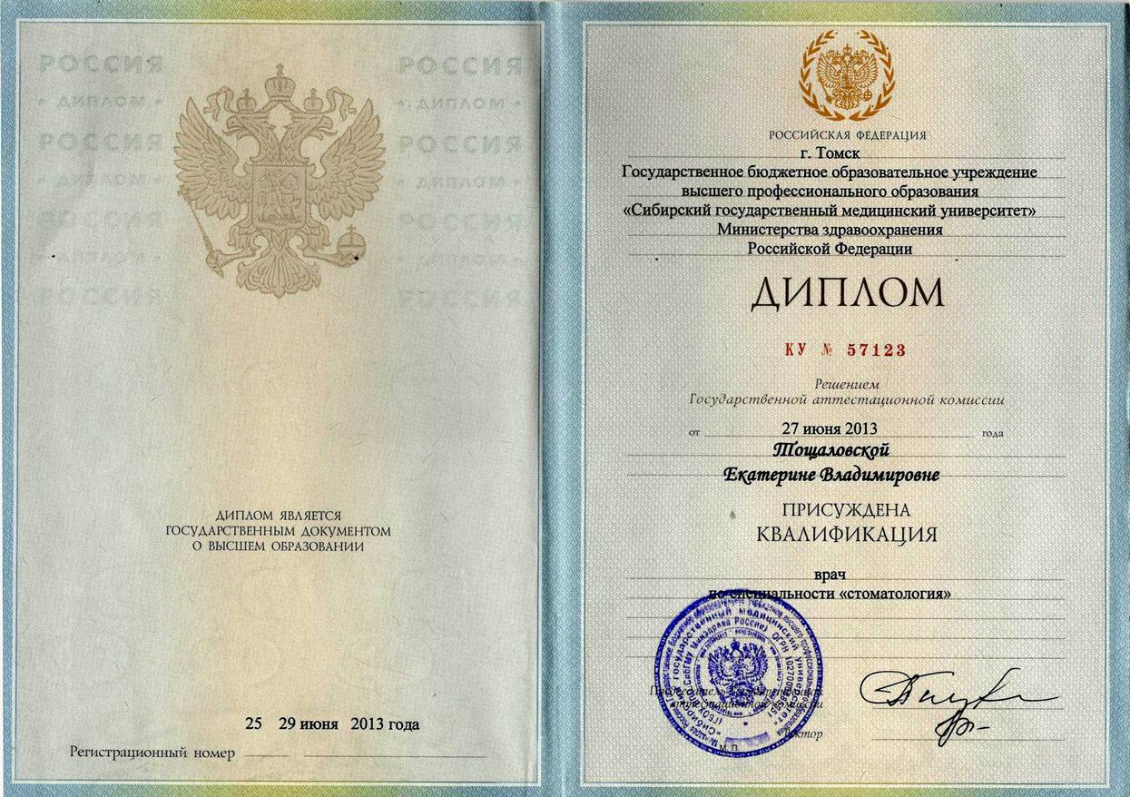 Диплом по специальности «Стоматология». ГБОУ «Сибирский государственный медицинский университет», г. Томск