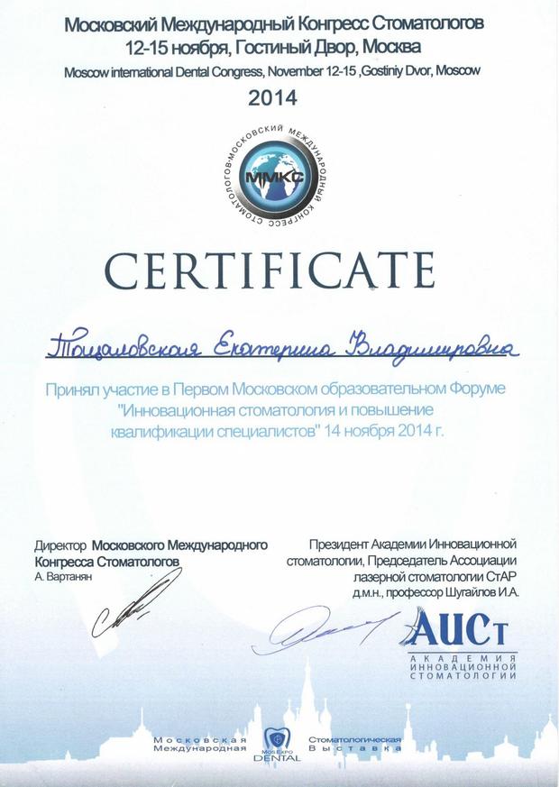 Удостоверение о повышение квалификации по специальности «Основы лазерной медицины. Применение лазеров в стоматологии». АНО ДПО «Академия инновационный стоматологии», г. Москва