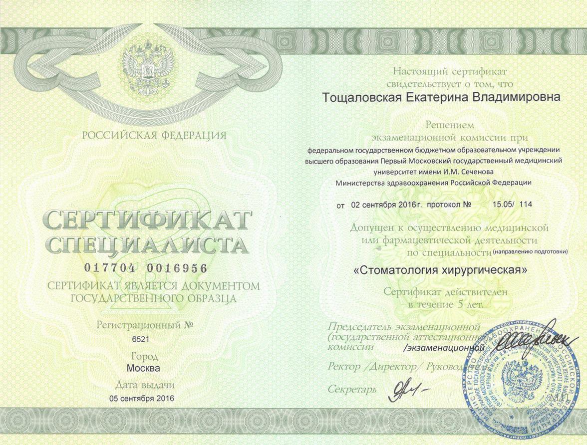Сертификат специалиста по специальности «Стоматология хирургическая». Первый Московский государственный университет им. И.М. Сеченова