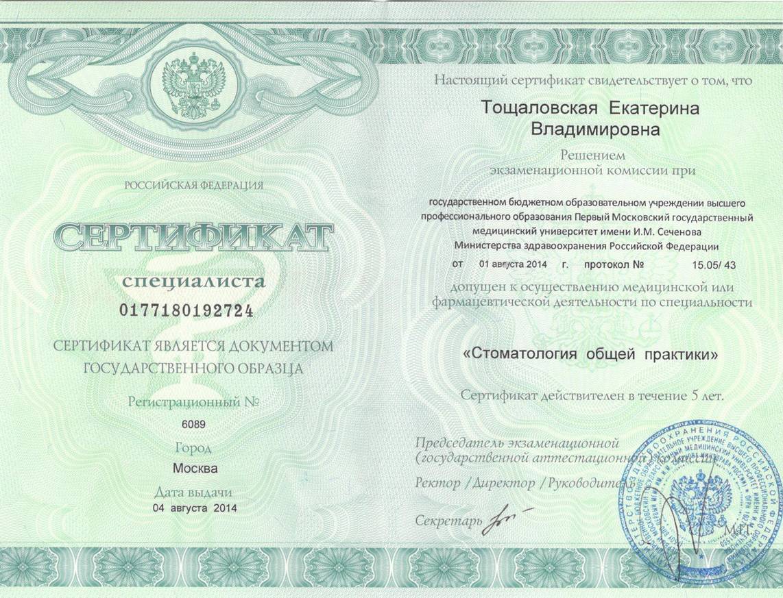 Сертификат специалиста по специальности «Стоматология общей практики». Первый Московский государственный университет им. И.М. Сеченова