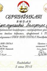 2013г. — Диплом об окончании интернатуры по специальности «Стоматология общей практики» ГБОУВПО «Северо-Осетинская государственная медицинская академия»;