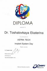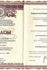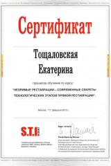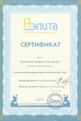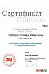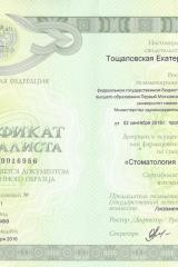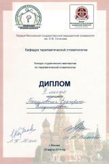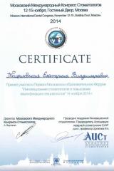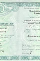 2014 г. — Сертификат специалиста по специальности «Стоматология общей практики». Первый Московский государственный университет им. И.М. Сеченова