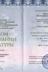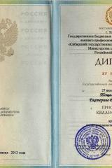 2013 г. — Диплом по специальности «Стоматология». ГБОУ «Сибирский государственный медицинский университет», г. Томск
