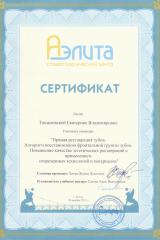 2018 г. — Сертификат по специальности «Основы лазерной медицины. Применение лазеров в стоматологии». АНО ДПО «Академия инновационный стоматологии», г. Москва