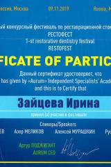 2019г. — Сертификат «Certificate of Participation» Первый конкурсный фестиваль по реставрационной стоматологии РЕСТОФЕСТ