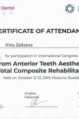 2019г. — Certificate of Attendance «From Anterior Teeth Aesthetics to Total Composite Rehabilitation» Tokuyama Dental