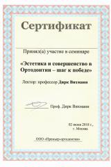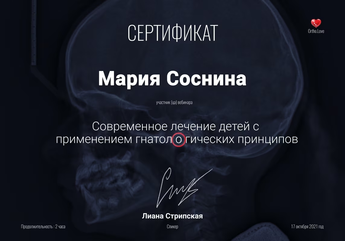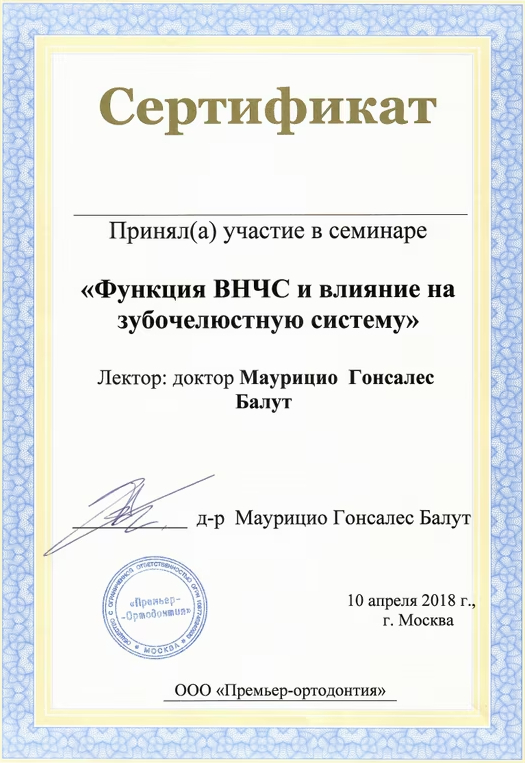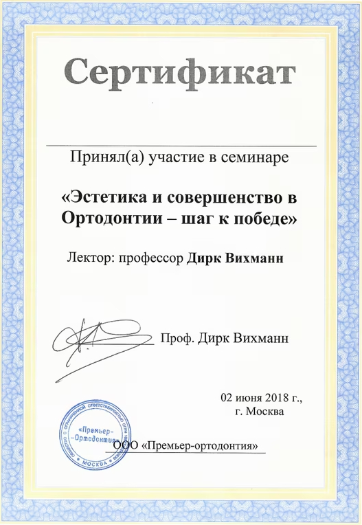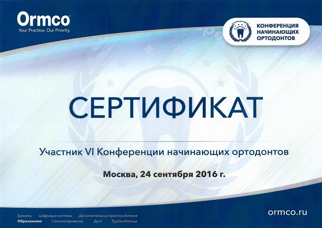 2016г. — Московский государственный медико-стоматологический университет им. А.И.Евдокимова, Ординатура по специальности стоматолог ортодонт.