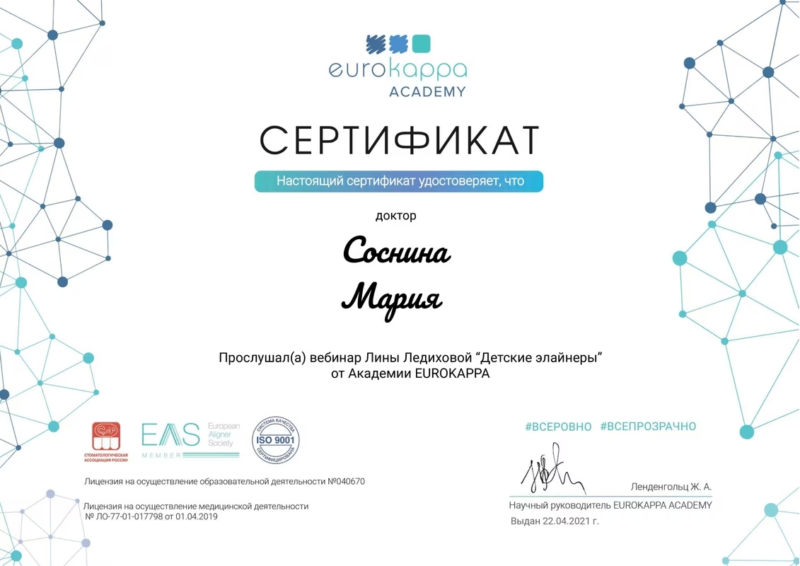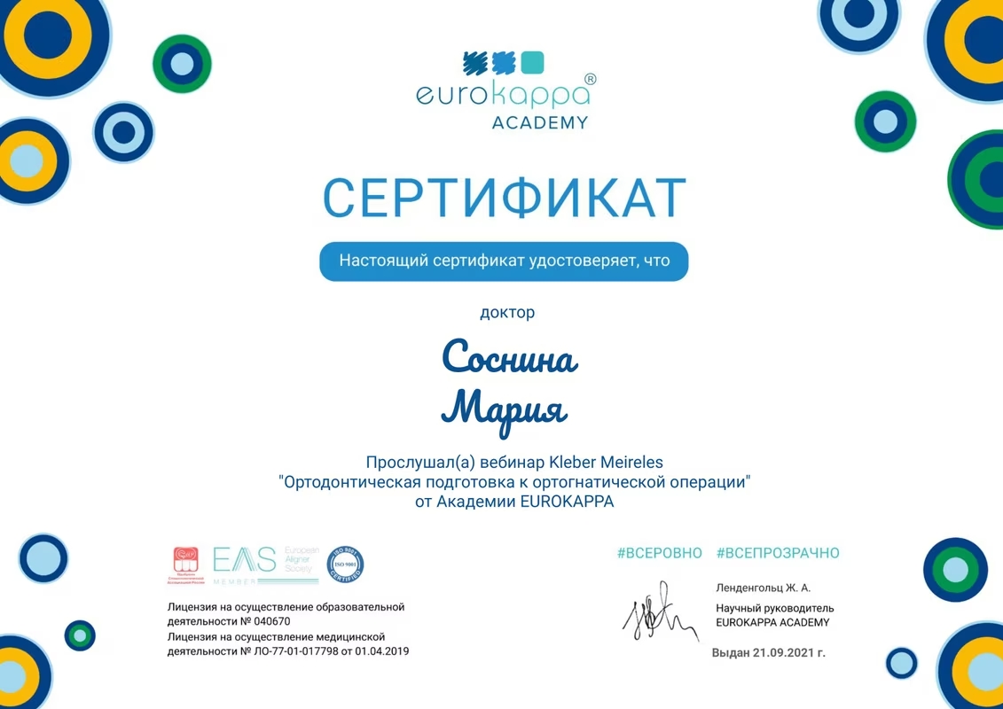 2015г. — Московский государственный медико-стоматологический университет им. А.И.Евдокимова, Диплом по специальности врач-стоматолог.