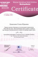 2011г. - Композитные и керамические реставрации в ежедневной практике. Методы восстановления передних и жевательных зубов. Проф. W.Devoto. Сертификат, г. Москва