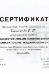 2016 г. - «Неотложные состояния в амбулаторной стоматологии. Профилактика и лечение. Моделирование Ситуации» на базе НИИ СП им. Н. В. Склифосовского. Сертификат, г. Москвы