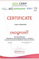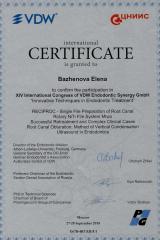 2012г. - Курс лекций компании VDW о современной эндодонтии, системе RECIPROK, методах вертикальной конденсации корневых каналов. Сертификат международного образца, г. Москва