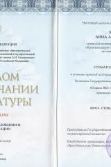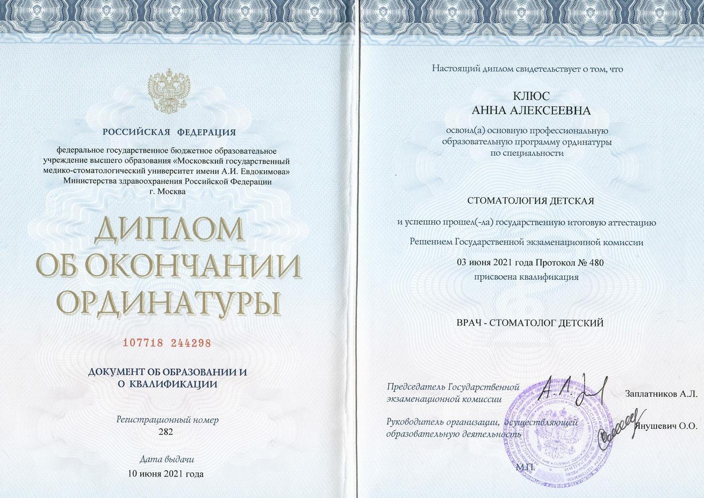 2021г. – Московский государственный медико-стоматологический университет им. А.И.Евдокимова, ординатура, специальность Стоматология детская