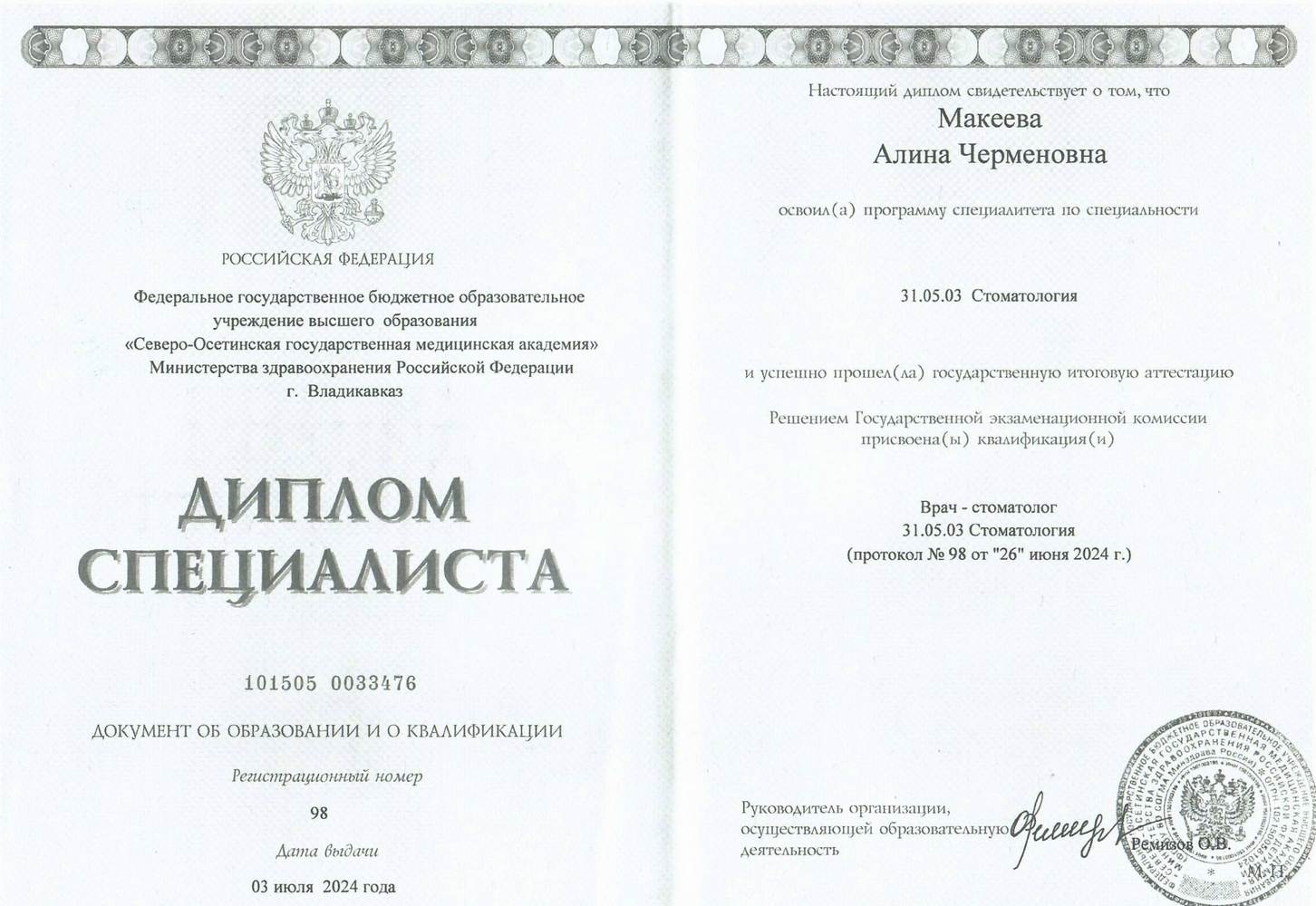 2024г. – Федеральное государственное бюджетное образовательное учреждение высшего образования «Северо-Осетинская государственная медицинская академия» Министерства здравоохранения Российской Федерации, врач-стоматолог